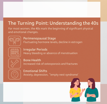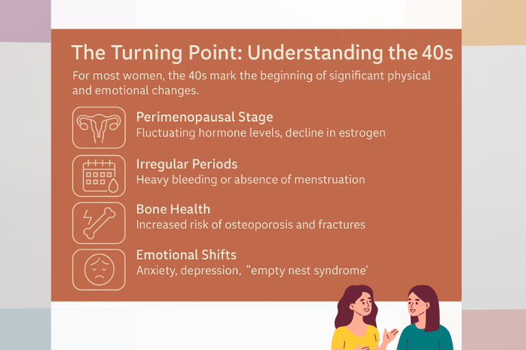 Despite these challenges, the 40s can be a powerful phase of transformation. This is the time for women to redirect their energy inward and prioritize their well-being—something that may have been neglected while attending to the needs of family, career, and others.